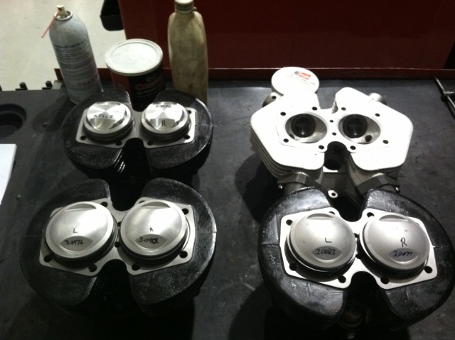 Two Triumph T140 cylinders and a T100 Cylinder, painted, decked, bored and honed to .004. T140 head bead blasted, cleaned. New valve guides, valves, and springs installed after completed valve job.